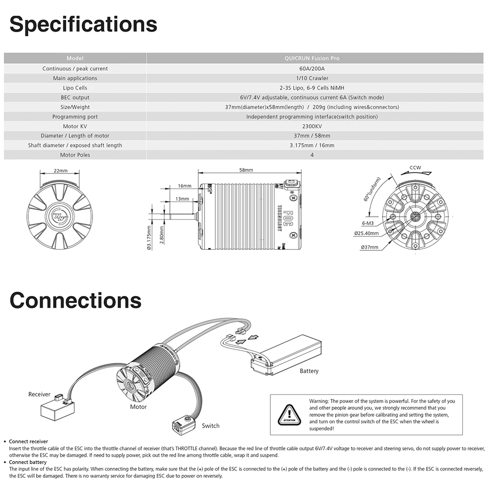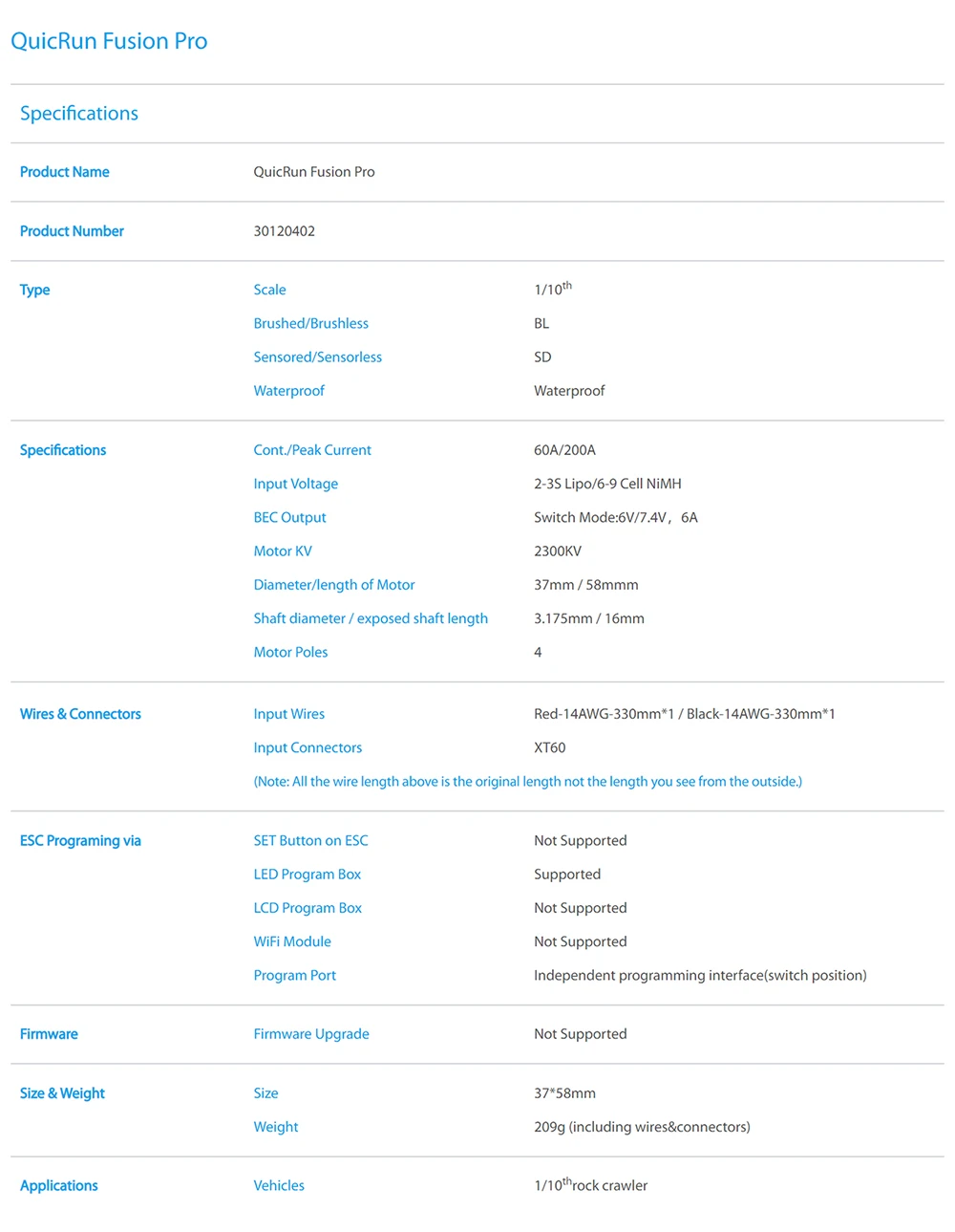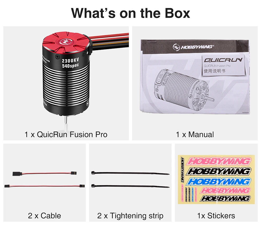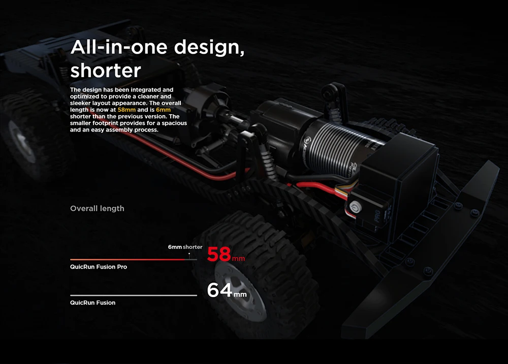 HobbyWing QuicRun Fusion PRO brushless motor and esc combo 2-IN-1 is an integrated design brushless system of the ESC and motor that greatly reduces the overall volume and weight.The significant is increase and has three operating modes,FOC drive,crawl worry-free,multi-gear adjustability,stop when its required refine parameter items.Advanced and secured electronic,switch applicable to all weather & attack conditions .