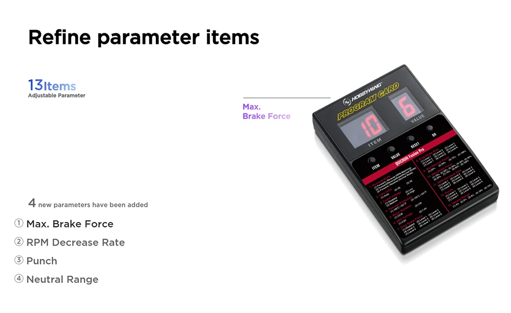 The LED program box is for programming HobbyWing brushless ESCs. Its friendly interface makes ESC programming easy and quick
