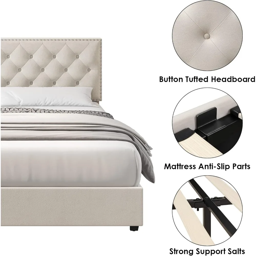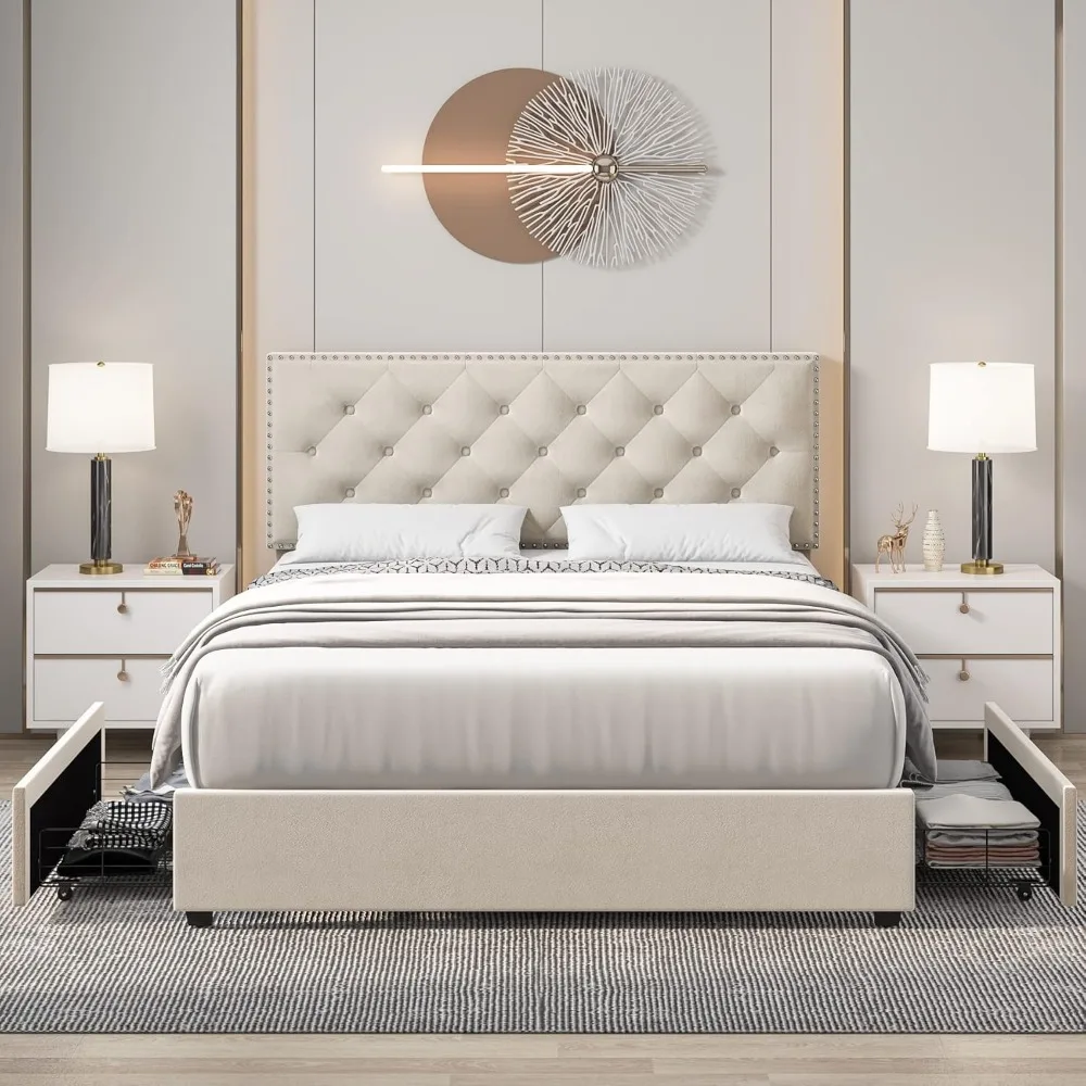 HOSTACK Full Size Bed Frame with 4 Storage Drawers, Modern Upholstered Platform Bed with Adjustable Headboard,Button Tufted Bed