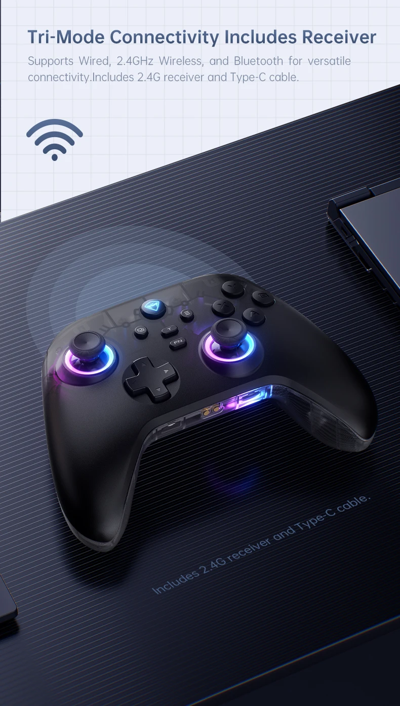 Supports Wired, 2.4GHz Wireless, and Bluetooth for versatile connectivity.Includes 2.4G receiver and Type-C cable.