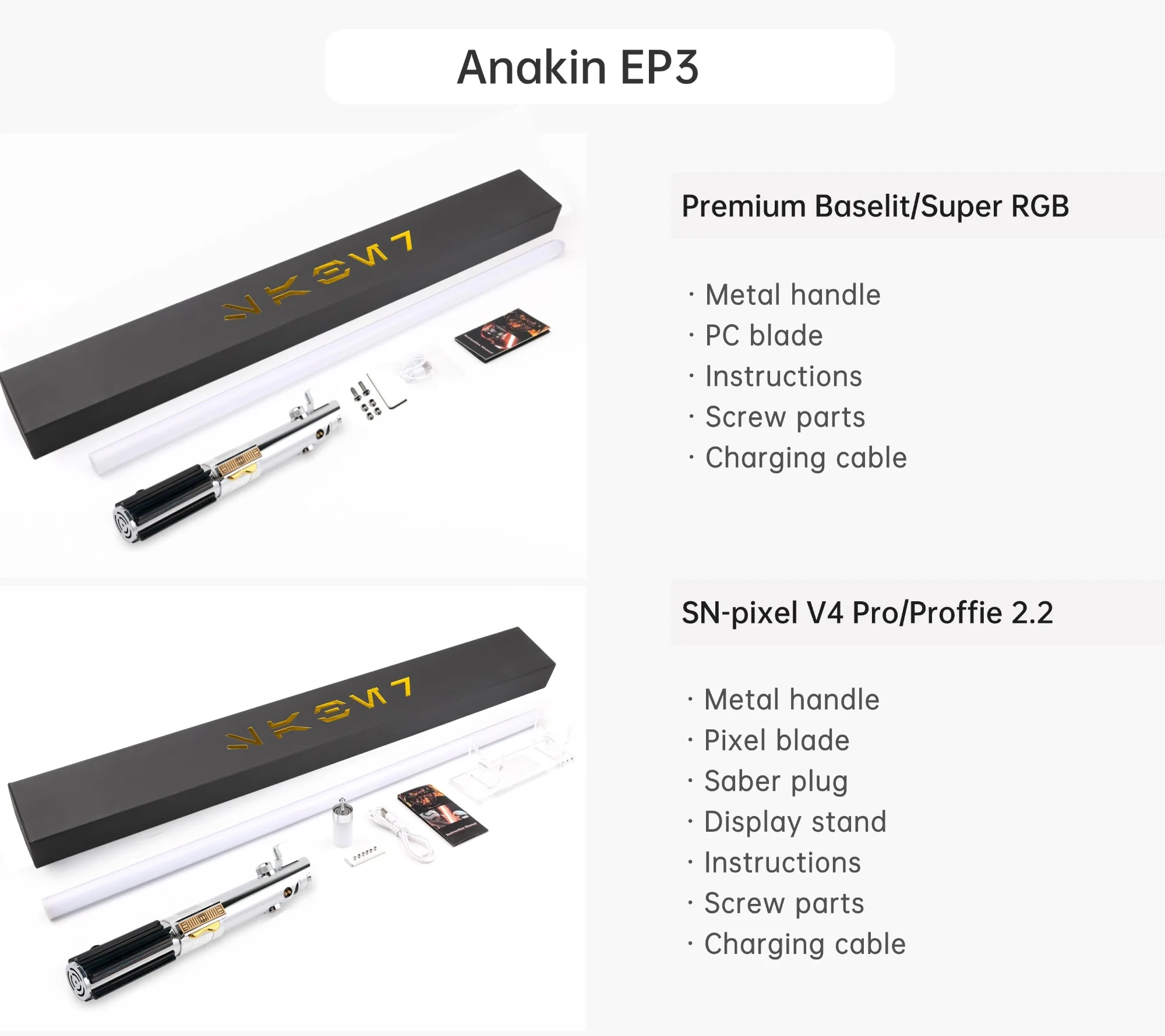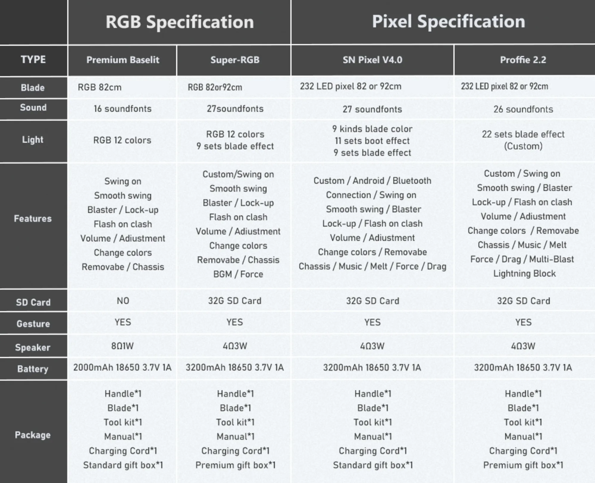 "SN-pixel V4 Pro"PIXEL version(with SDcard), 27 sound effects,12 Kinds Blade color,19 sets blade effect,12 sets boot effect,Bluetooth connection,Customizable